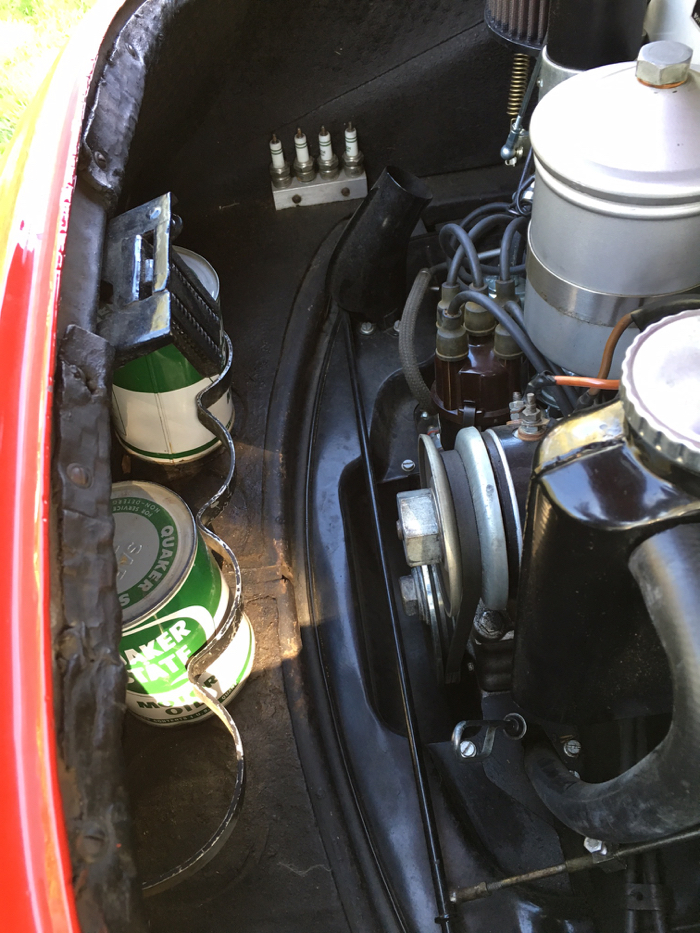 Neat little spare oil cans and spark plugs in a handmade aluminum holder—typical in days gone by.