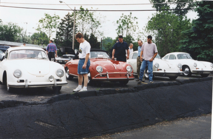 Mike Kopsic with a 356A Cabriolet on a rotisserie to the right.
