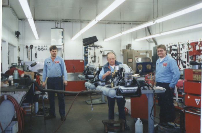 Dale Bush, John Truman and Mitch Burrows working on our 356 engine rebuild program in the early 90s.
