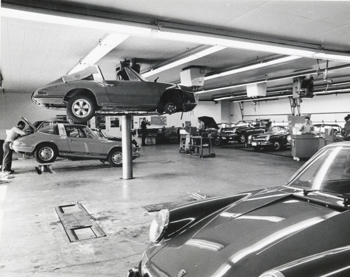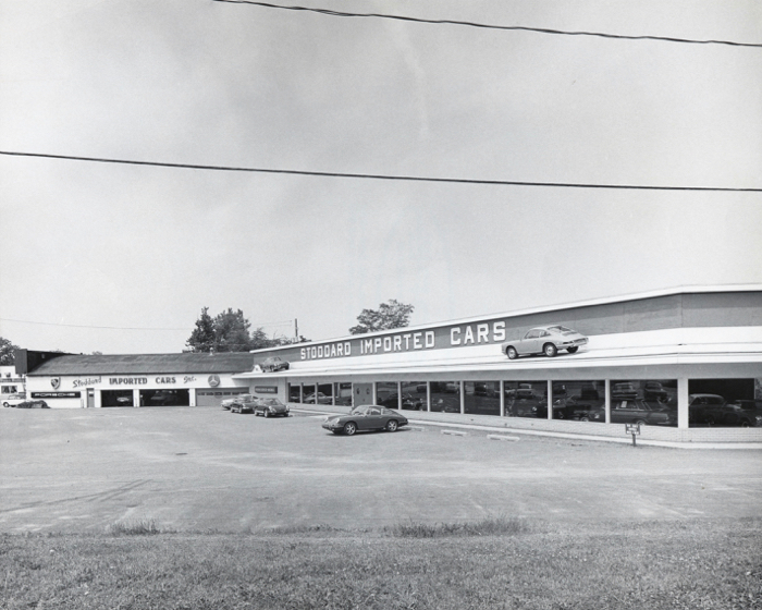 A shot of the dealership in the 1960s with a Volvo 1800s and a 912 on the roof!
