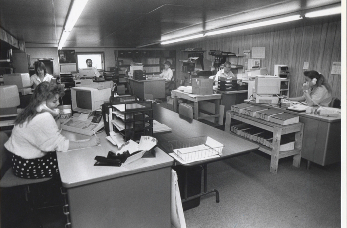 Kris K., Dan Holt, Paul Domitrovic, Dale Stiebeling, Woody Hinkle and Cheryl in the Phone Sales Office in the 1980s.