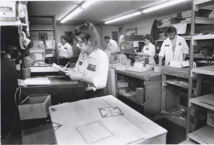 Sarah P., Mitch B., Gary, Terry and Kevin Rushworth in the Shipping Department, circa 1990.