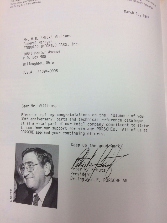 A letter to Mick Williams (our manager in 1987) from Peter Schutz, the President of Porsche AG on our 30th anniversary. This letter illustrates the close relationship we've always had with the Factory.