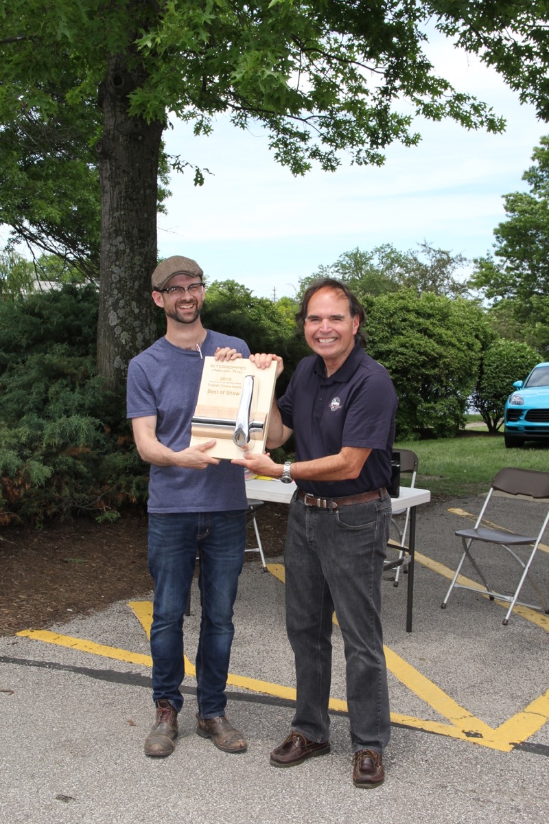 Jesse Nolan from Across The Pond Restoration accepting the Best In Show award for the Roadster.