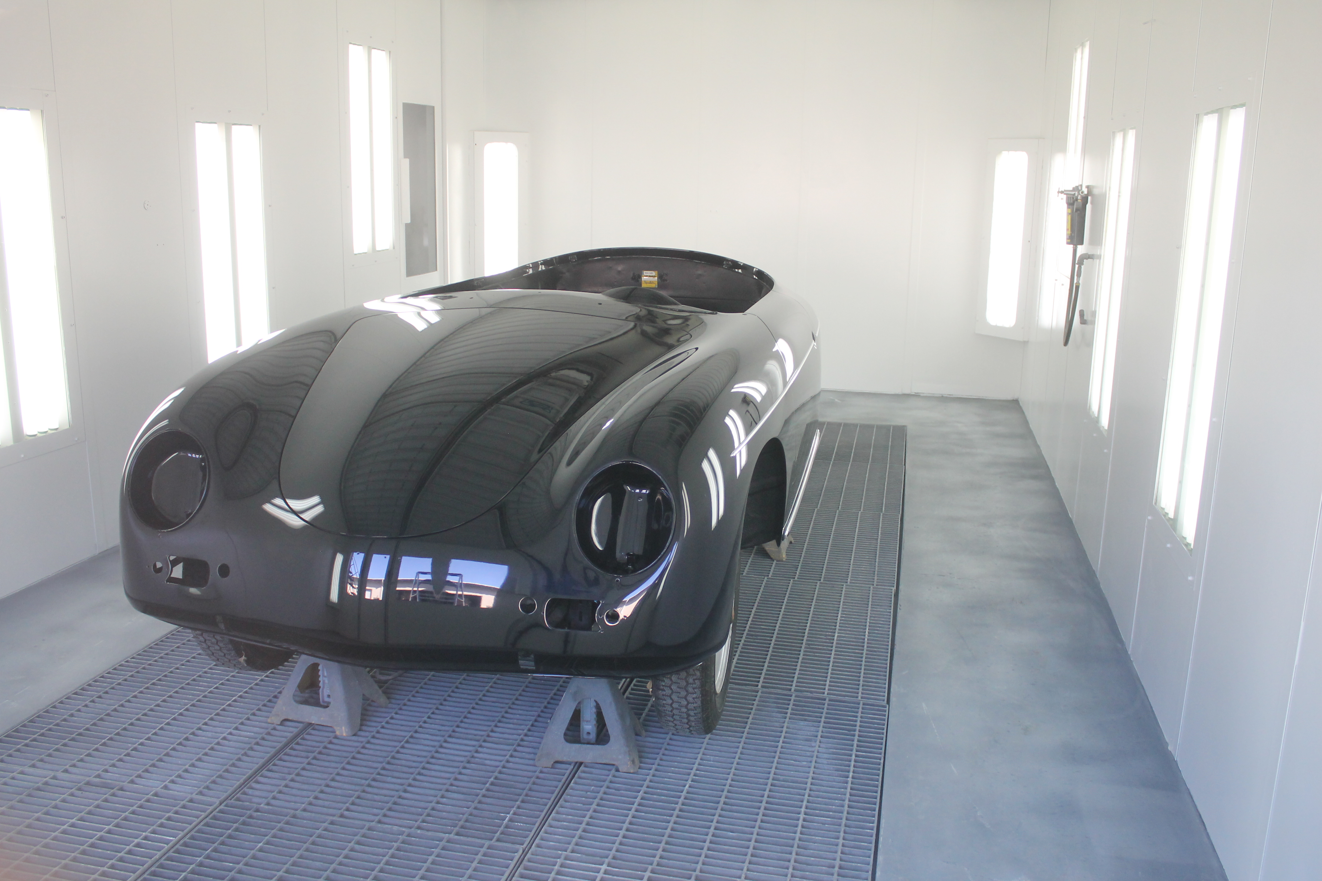 I always love paint booth photos, and this one is no exception. There's just something great about the contrast of a freshly painted black body in an all white booth. So cool.