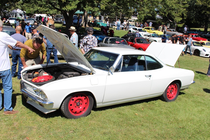 One of the more interesting weird cars that showed up was this Chevrolet Corvair. Trust me, it's far from stock. As you can see, those are Porsche 944 Turbo aluminum spare wheels on all four corners, but that's just the start of it. This is an all-wheel-drive car, using the front suspension from a 964 Carrera 4, and the rear suspension from a 993. In addition to the suspension, this car also uses a 993 sourced 3.6 liter flat six and 6-speed transaxle. This car absolutely must be a riot to drive. Classic American looks with an all-German heart? Yes, please.