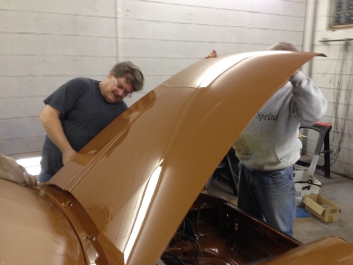 Our next step is to bolt the hood and fenders on. We used several people on the hood to insure no damage to our fresh paint.