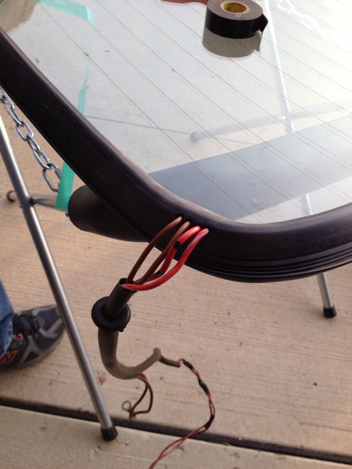 After the wires get fed through the seal, the next tricky part is to get the window positioned correctly in the opening. A typical trouble spot is the vent area at the top, where the window won't want to set down far enough. We used a suction cup to "pull" the window into position.