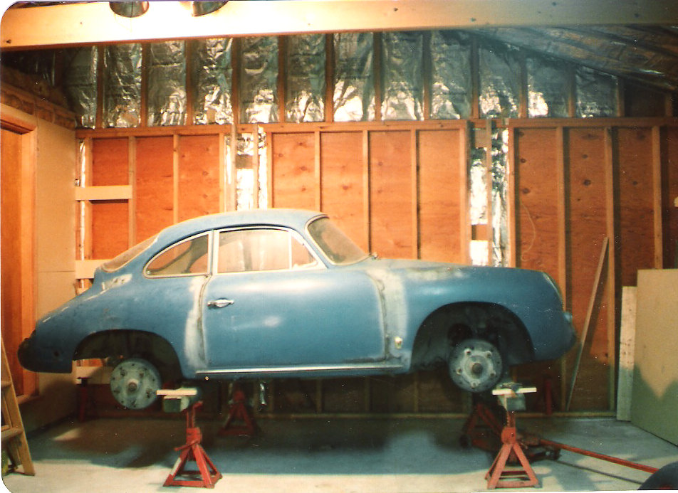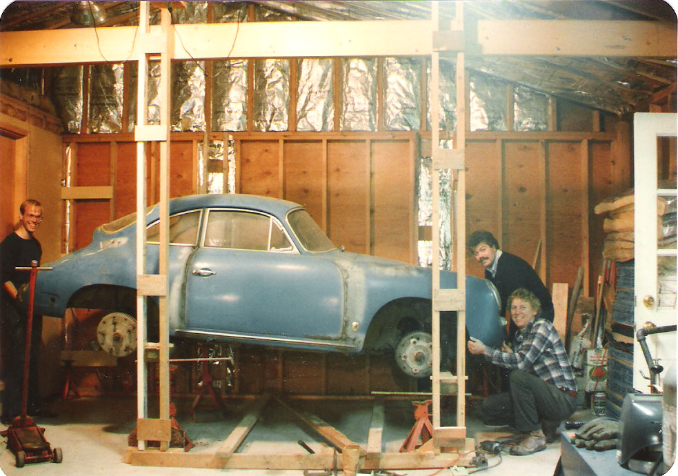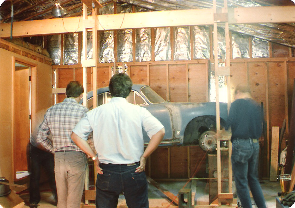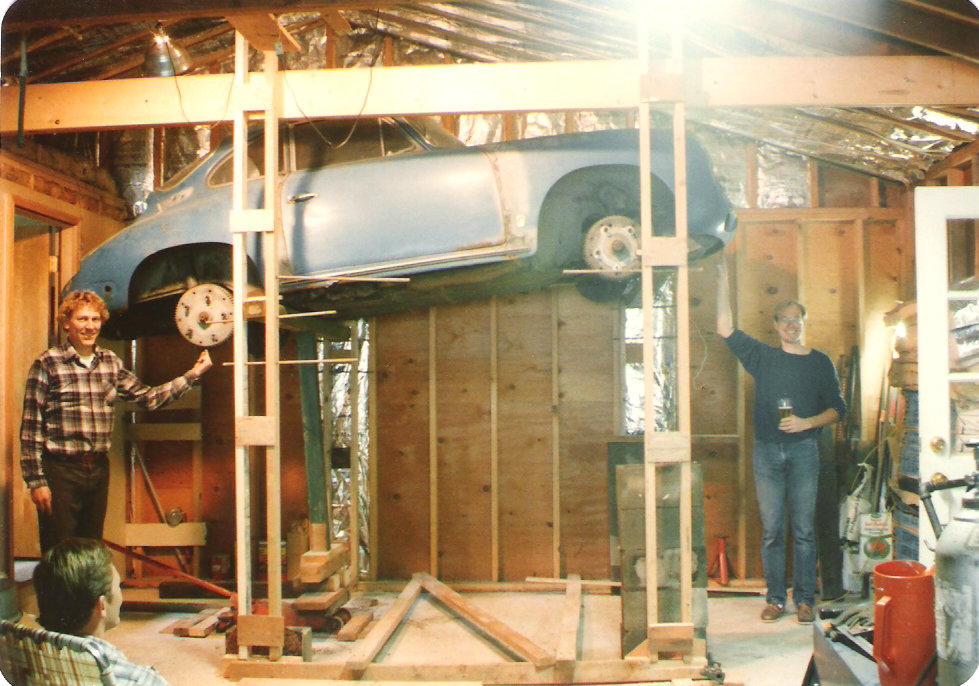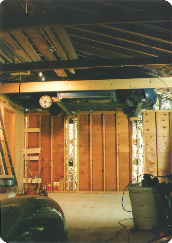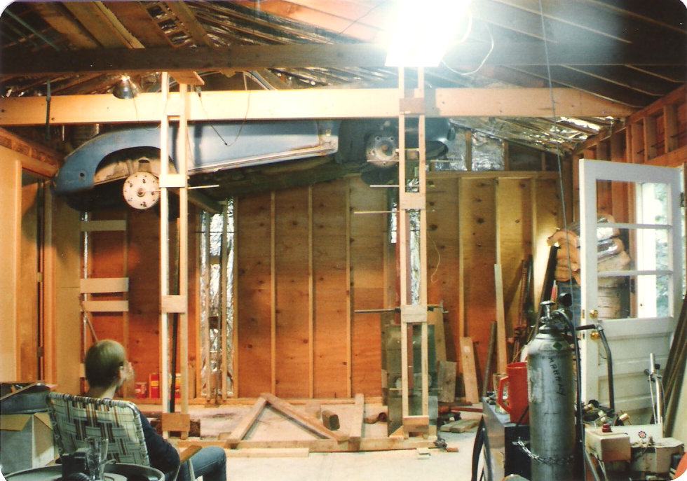 You can see the car is resting on a couple landscape timbers sitting on the jackstands. I estimate with no engine or wheels, car weighs about 1700-1800 so max. about 450 lbs. per corner. Left side of car rests on back wall of garage. Original 2x6 garage collar cross beam was reinforced by sistering on a 2x10. Didn't sag in middle of 19 foot span more than 1/8" after car was up. Built and temporarily installed wooden posts to guide the timbers as the car was iterated up in steps. (Yes- I kept them to get car back down!). Holes were cross drilled through the wood guides to insert solid steel rods to rest the timbers on. Each end of the car went up 6" at a time. The whole process only took about two hours. Once up, installed 3/8" threaded rod to support the end of the timbers on rt. side of car. Pics show guideposts removed at end.
