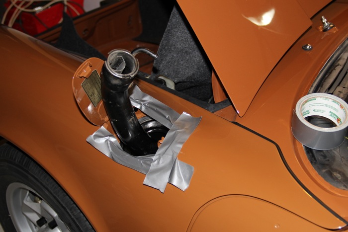 After we were done oogling the car in the light of day, we rolled it back in our shop and installed the fuel filler tube. We protected the surrounding paint with several layers of tape in case we slipped during installation. Of course, new rubber parts are being used throughout this restoration, including the filler neck.