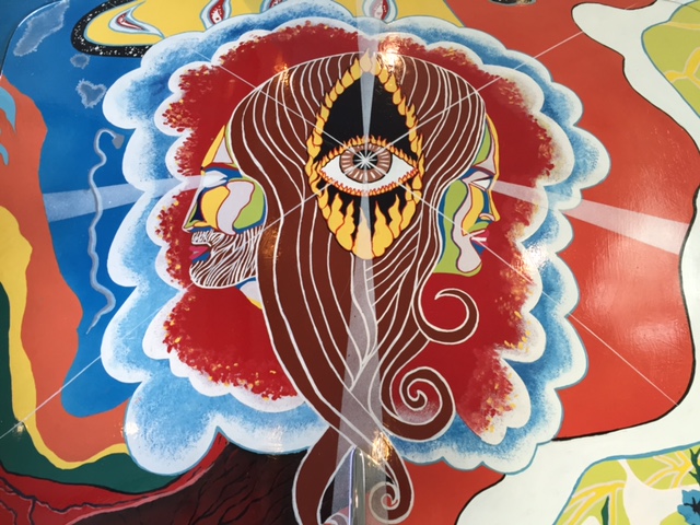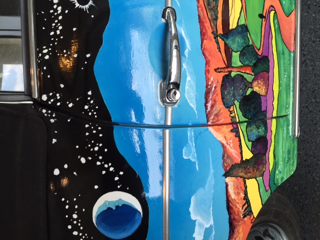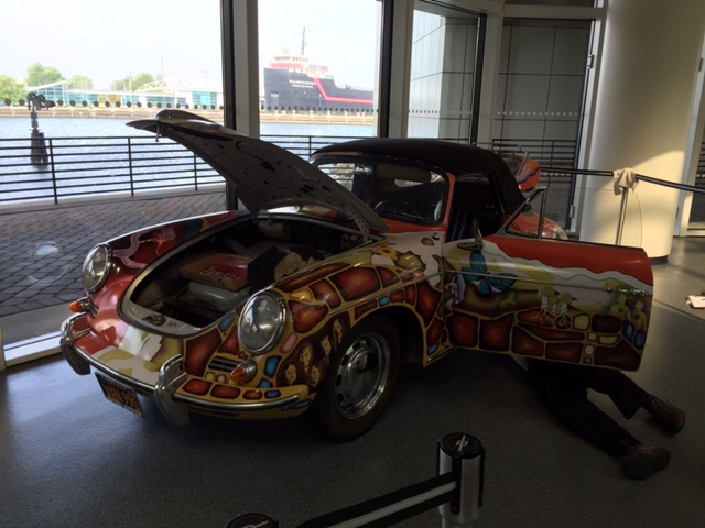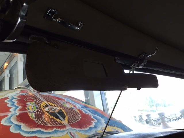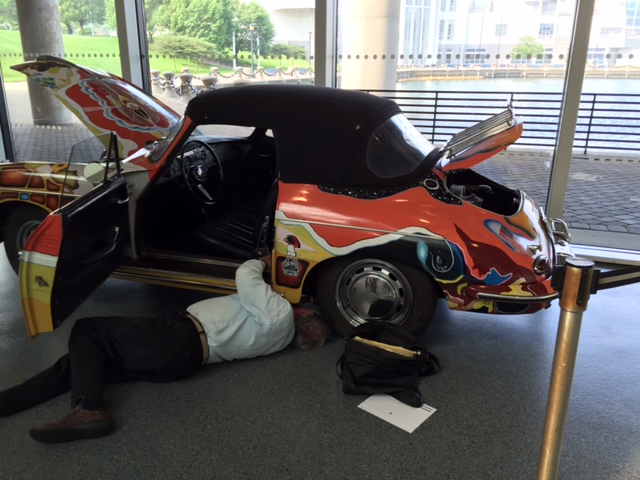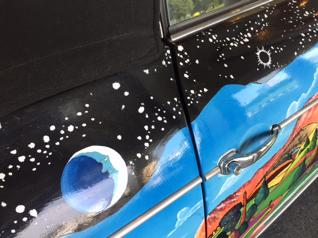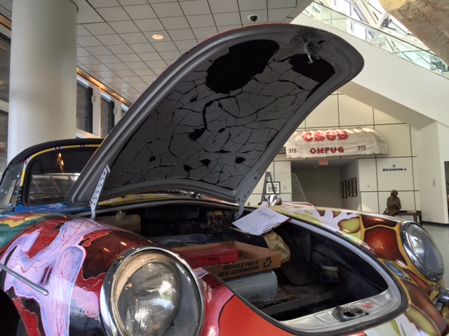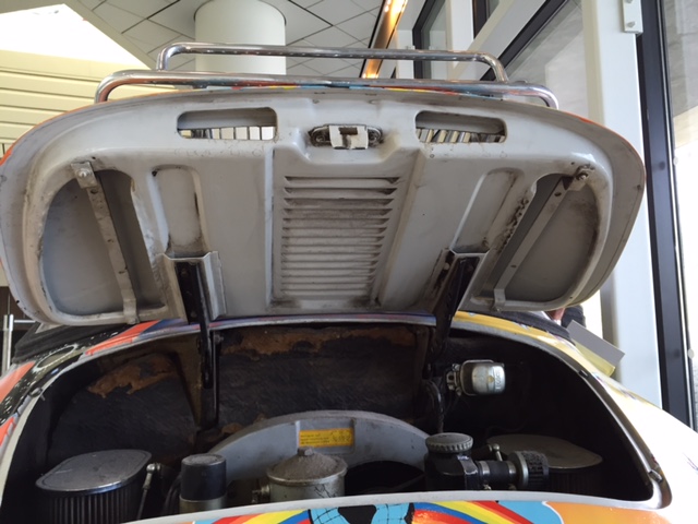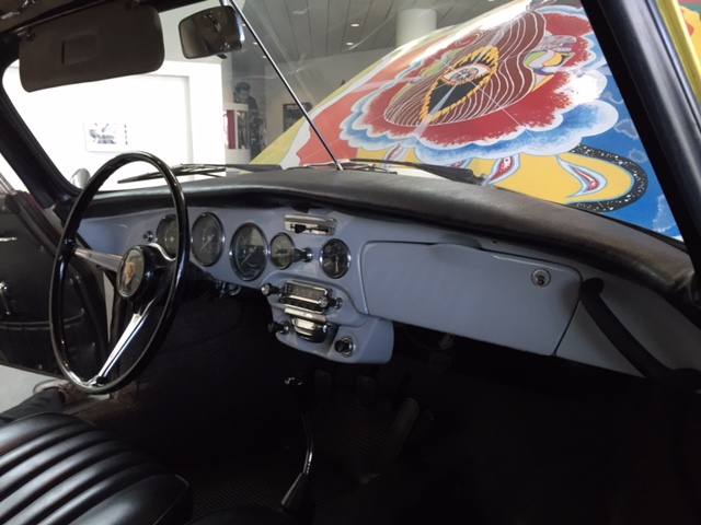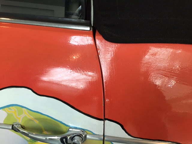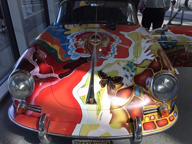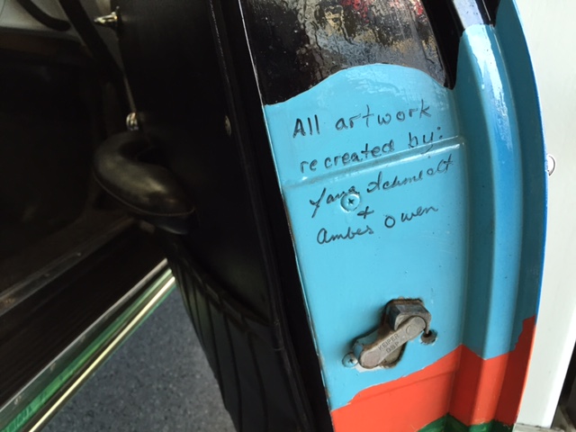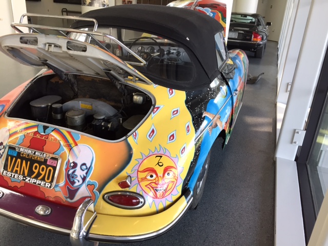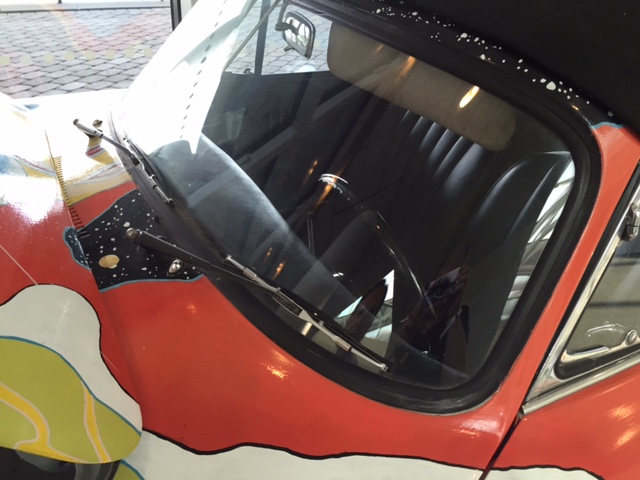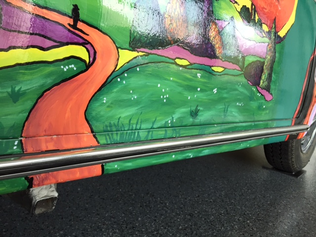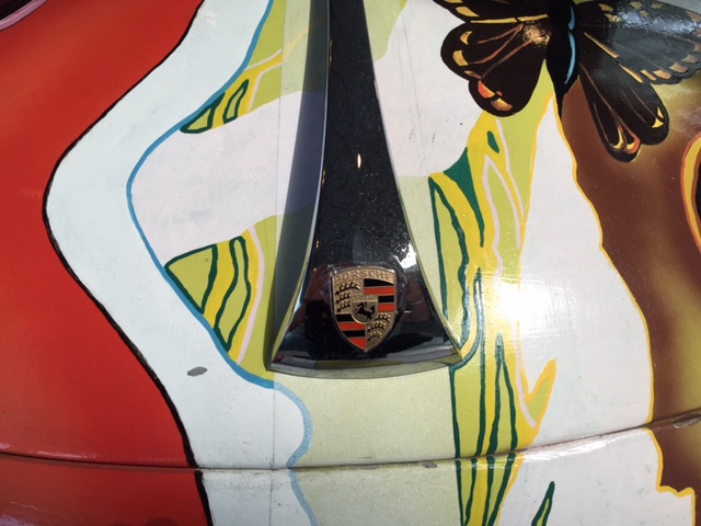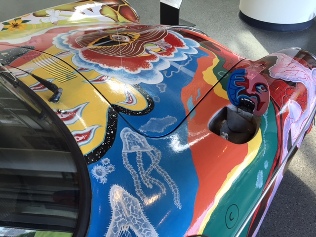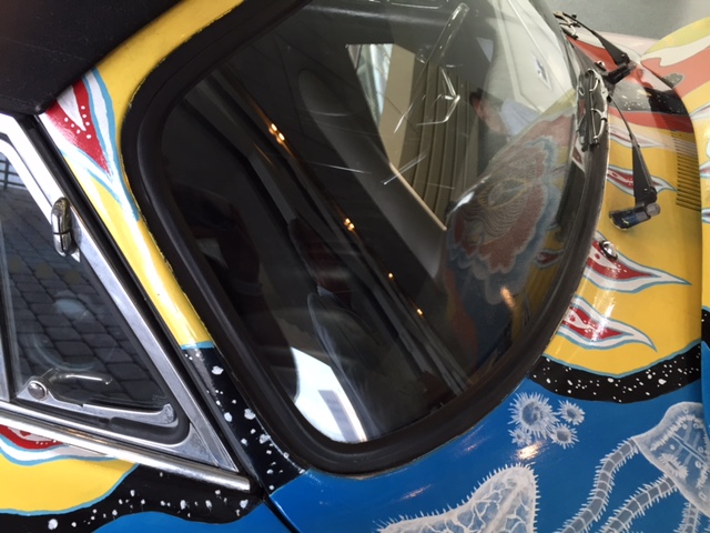 After the car was returned to the Joplin familiy in 1973, It was repainted back to the original light grey. Janis's brother Michael Joplin had the artwork recreated, hence this pair of signatures. You can notice that some details, like the side mirrors, turn signals and luggage rack have changed through the years.