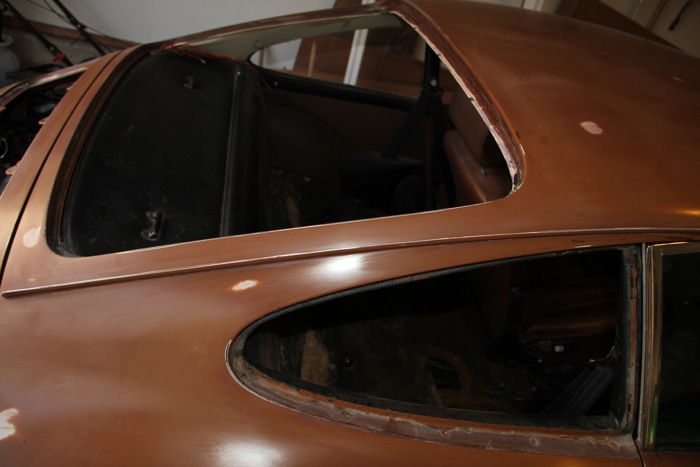 We're continuing our work on the 1973 911, including pulling the windows out in preparation for paint. The nose of the car is essentially bare steel, while much of the rear is down to the original Sepia paint. We would prefer to use as much of the original paint as possible as a primer for our new paint finish--good factory paint is a great base.