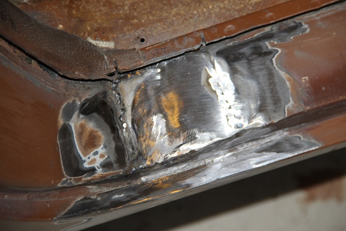 We did find a spot of rust under each sill plate. We cut out the affected area and made a nice clean patch. We're pretty happy to save the original rocker panels as these are hard to get just right. This patch needs a bit for finish grinding to before getting sealed up.