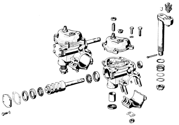 For 356A T-2 thru 356C cars, the steering box was manufactured by ZF-Germany. It’s referred to as a Ross design, or better known as worm and peg. Here’s an exploded view of this box.