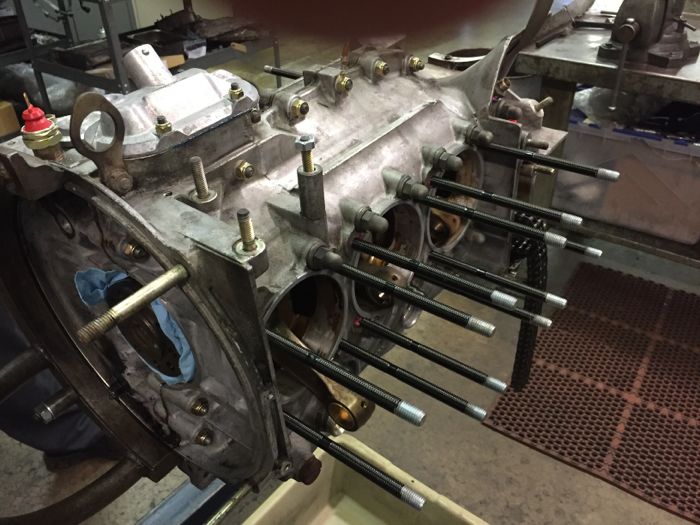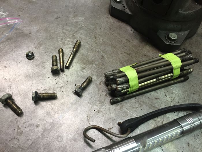The bad studs were removed from the case by welding a nut to the broken nubs. Of course, this means all six piston and cylinder assemblies were removed from the case. We were now in pretty deep—although the case was not split open.