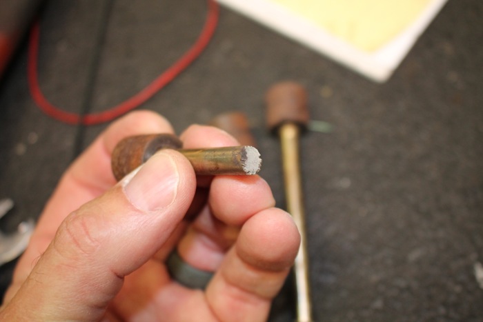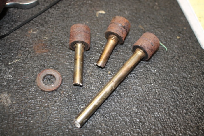Here's one of the broken studs and you can see where the crack propagated from a section where the outer surface had some corrosion—the darker spot on that crack is where the corrosion started eating into the metal before it finally let go completely at that point.
