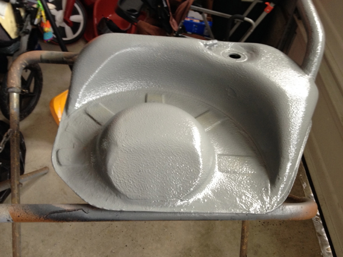 After the interior of the tank was cleaned out, we scraped the outside and reappiled a Wurth Schutz to match the original texture. This was treated with a coat of our grey exhaust paint, as well as a clear coat to more closely match the original grey pebbled finish. Note: if the issues with corrosion were a little better, this process would have worked. Unfortunately, we wound up replacing the tank