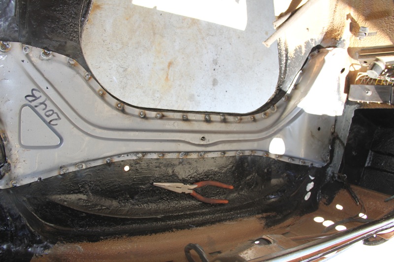The good news is that while there was some rust in the suspension pan, it was deemed saveable and we patched a few sections after we cleaned it up with a wire brush on a grinding wheel. We then replaced the fuel tank support with one of our new reproduction pieces.