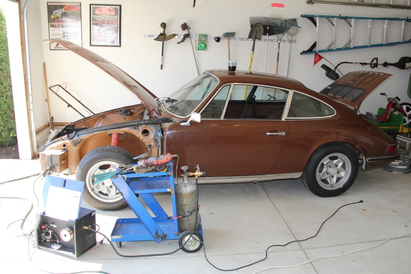 Nearly every early 911 exhibits the same rust pattern in the front trunk area. The original twin batteries will leak acid, compromosing the battery boxes, the fuel tank support and finally, the front suspension pick up points. We knew that our fuel tank support needed some patching, but we weren't sure if the rust had extended all the way down into the suspension pan.