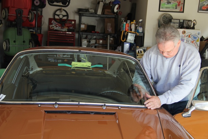 The seal is first installed on the windshield off the car. The aluminum trim is very fragile and easily damaged—we replaced ours with new factory pieces. The trim has to be pressed into the seal on the glass before the window goes in the car. It is impossible to do otherwise. A nylon cord is fed into the molded cavity that matches the flange on the bodywork.